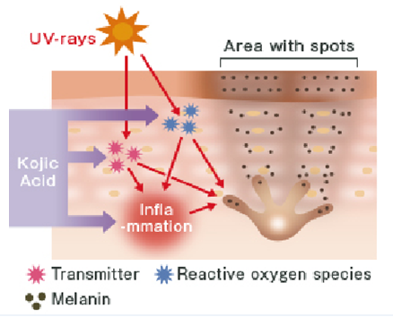 Kojic Acid: Kojic acid is also an anti-tyrosinase agent and is widely used by cosmetic industry for skin lightening. It inhibits the inflammation, reactive oxygen species and melanin synthesis. Kojic acid effectively treats dark spots on skin, hyper-pigmentation, melasma and wrinkles.