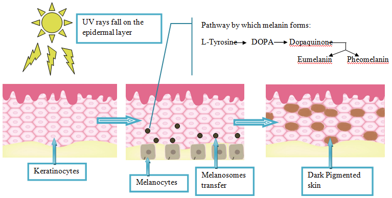 Melanogenesis refers to the production of melanin from the melanocytes. When sun rays fall on the epidermal layer, it results in the maturation of the keratinocytes and transfer of pigments or dark color in the body which reveals the surface color of the body resulting in the dark spots on face or body.